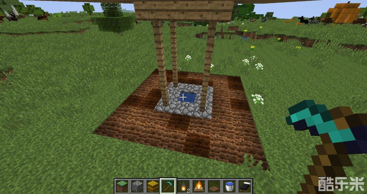 1、回到下面,圆石正中间挖开,水桶往中间补上水。用镐在周围打两圈耕地。