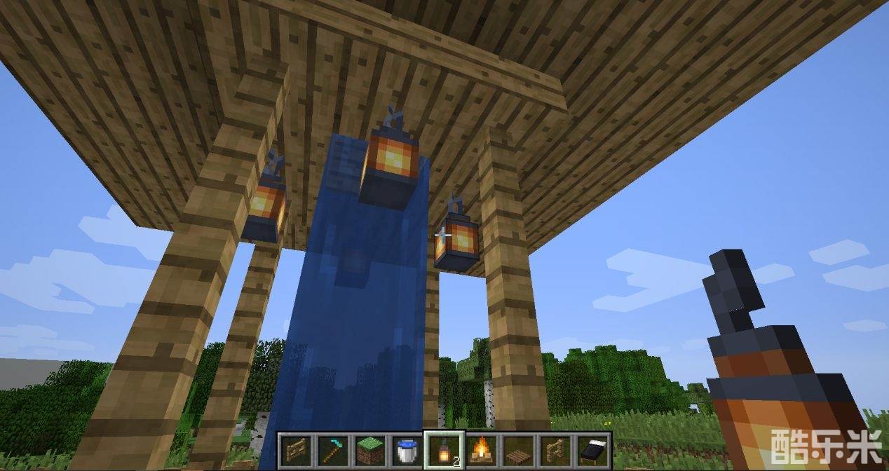 3、水桶对准底部缺口灌一次水,然后水柱四周加上灯,通过水柱上到小屋内,在缺口处放上任意活板门,水电梯就做好了。