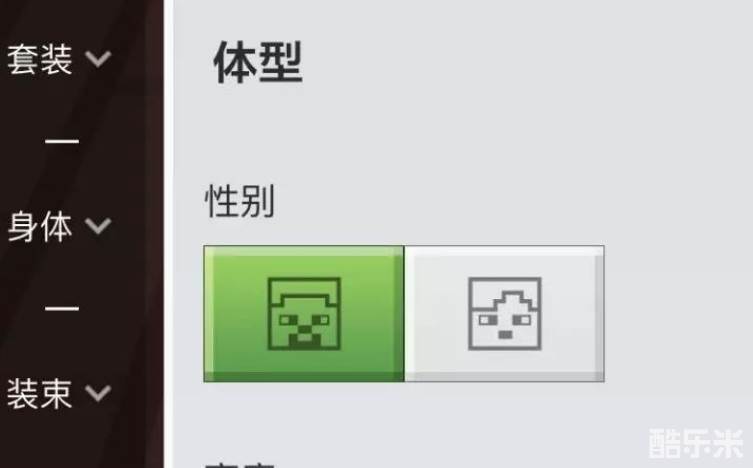 点击“个性化”标签,进入个性化皮肤界面,界面左侧列表,可实现对套装、搭配、身体、装束、体型的设定。