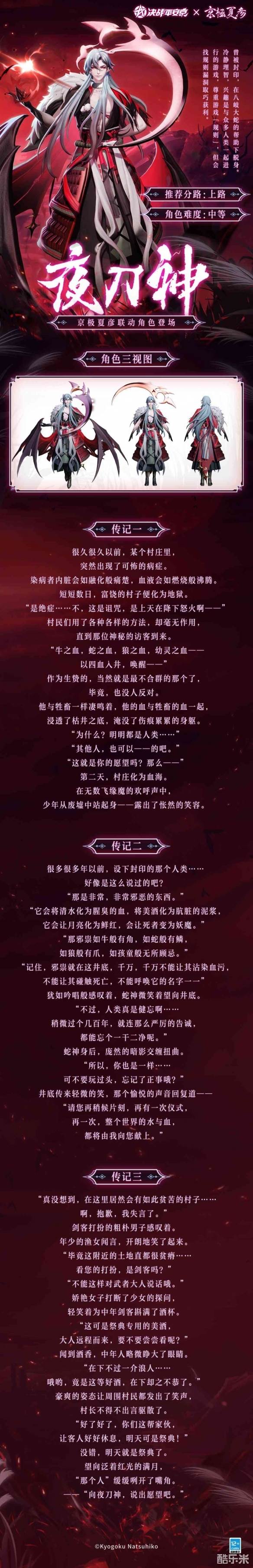 血海破除封印禁锢,井底之下的他骤然苏醒。夜镰挥舞,危机降临,来,向他诉说你的愿望——全新联动角色「夜刀神」将于2023年1月13日维护后降临平安京战场,还有角色皮肤「赤夜诡行」也将同步上线!大人们敬请期待与他所带来的「游戏」吧。