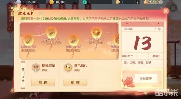 喜气盈门(累登奖励)将于1月12日0:00开启;福至万家(互动玩法)将于1月14日中午12:00开启;衔光照夜(坐骑抽奖)、新春联欢(休闲玩法)将于1月18日中午12:00开启;玉兔迎春(神兽抽奖)和团团圆圆(宴会玩法)开启日期为:1月9日心暖归家夜、1月14日团圆小年夜、1月21日除夕烟火夜、1月22日新春焰火夜、1月29日开工吉利夜、2月5日元宵月圆夜和2月14日情人和美夜,精彩活动、多重好礼惊喜来袭,全新玩法伴各位少侠欢度新春佳节!