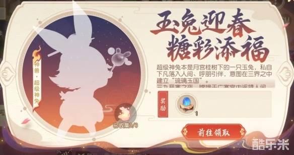 超级神兔本是月宫桂树下的一只玉兔,私自下凡落入人间、呼朋引伴,意图在三界之中建立“琉璃玉国”,有超级神兔左右相随,各位少侠必能心舒体畅,福运长伴。少侠们完成神兔现世任务后可获得阿玉的见面礼,打开见面礼后可领取五宝*1(仅限一次),并解锁超级神兔专属的神兜兜礼包。少侠们也可在活动界面中重温神兽剧情。
