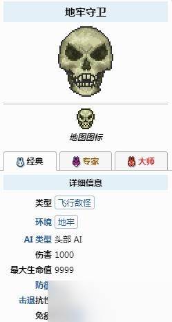 地牢守卫是一种无法通过正常手段击败的敌人,它拥有极高的生命值和9999的防御,以及足以秒杀绝大部分玩家的伤害。因此玩家如果试图在击败Boss骷髅王之前前往地牢,就会看到地牢守卫并被其秒杀。