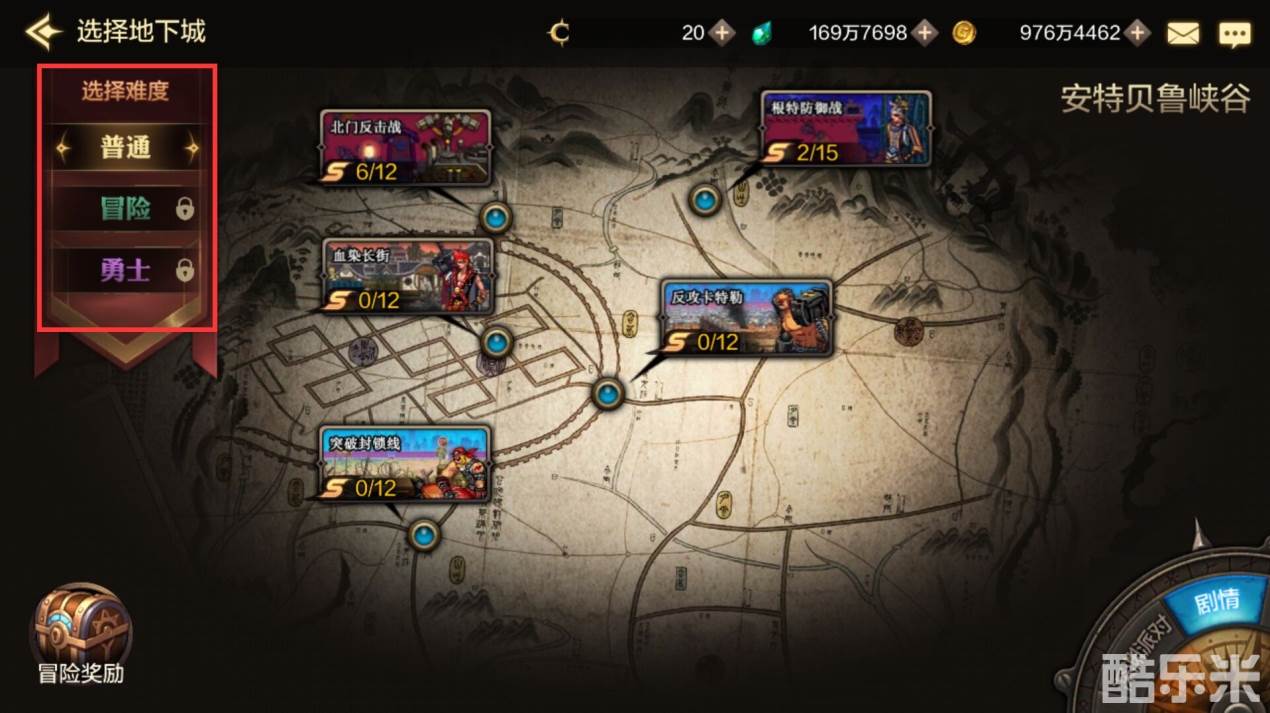 地下城副本难度从低到高依次为普通、冒险、勇士。当进入选择地下城界面后,直接在界面左侧的选择难度下,选择想要挑战的难度即可。难度越高,怪物的血量以及防御就越高,希望各位勇士在挑战时要谨慎选择。