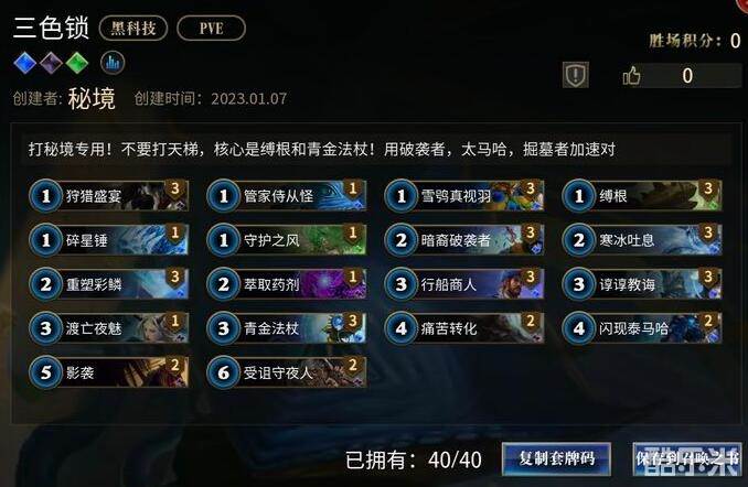 总而言之,三色锁就是锁住对面的怪,让对方无法攻击,自己再使劲撕对面的牌,使对面牌库的牌为0,当对面没牌时自己就赢了 ~最后注意这套卡只能打秘境,打天梯会被打的找不到北!