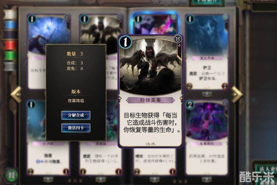 次核心是「狩猎盛宴」。效果是受多少血恢复多少血,注意多张狩猎盛宴能同时作用于一只怪,也就是说,当你对一只怪使用两张狩猎盛宴,他打你一下,你不仅不掉血还回血!但是当你对一只怪使用两张狩猎盛宴后,怪基本上就不会攻击了~