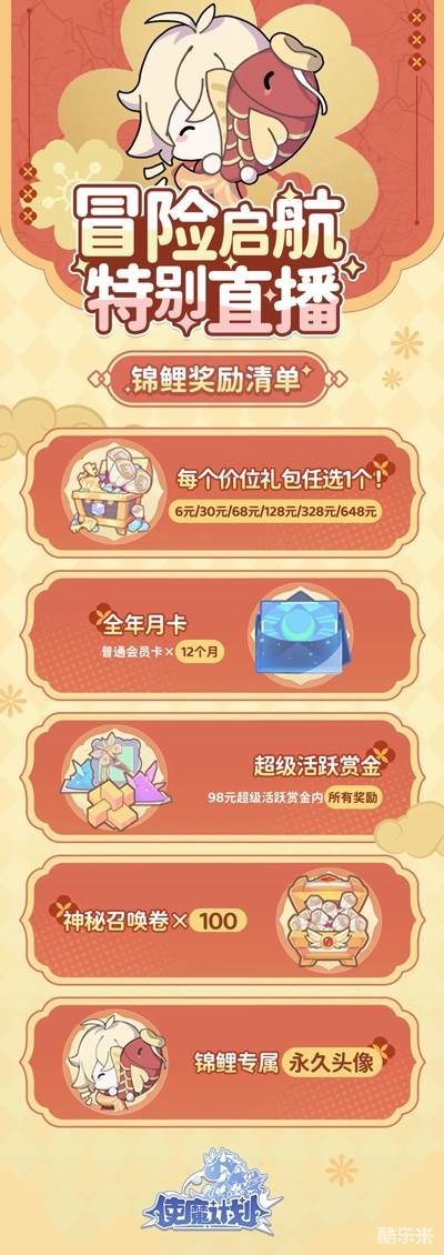 在“冒险起航特别直播”中,官方准备了多个惊喜福利,将随着节目进程不断抽出,百分百中奖几率,真诚交流无套路。在直播最后,更是会抽出锦鲤大奖!奖励包括100张神秘抽奖券、全年月卡和所有价位礼包任选!锁定官方抖音直播间,福利盛宴,静候大家来领取!