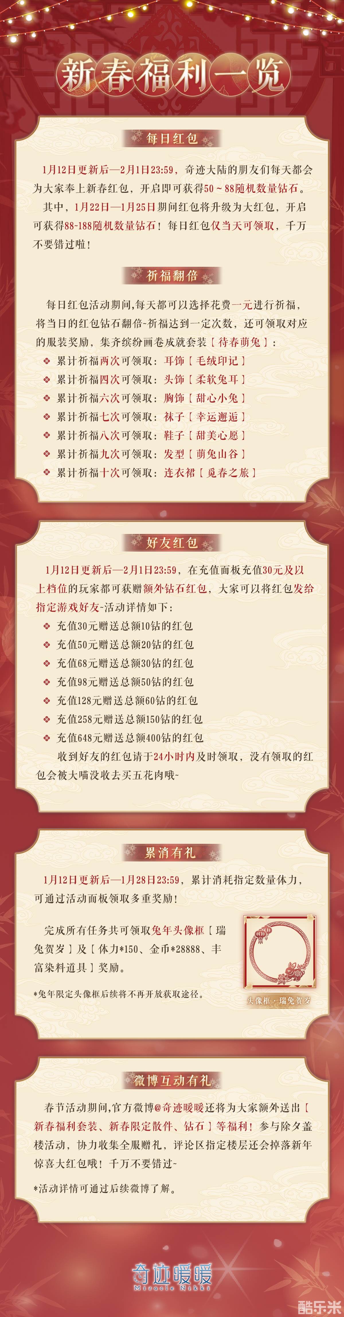 5、春节活动期间,奇迹暖暖还将为大家额外送出【新春福利套装、新春限定散件、钻石】等福利!活动详情可通过后续公告了解,敬请关注~
