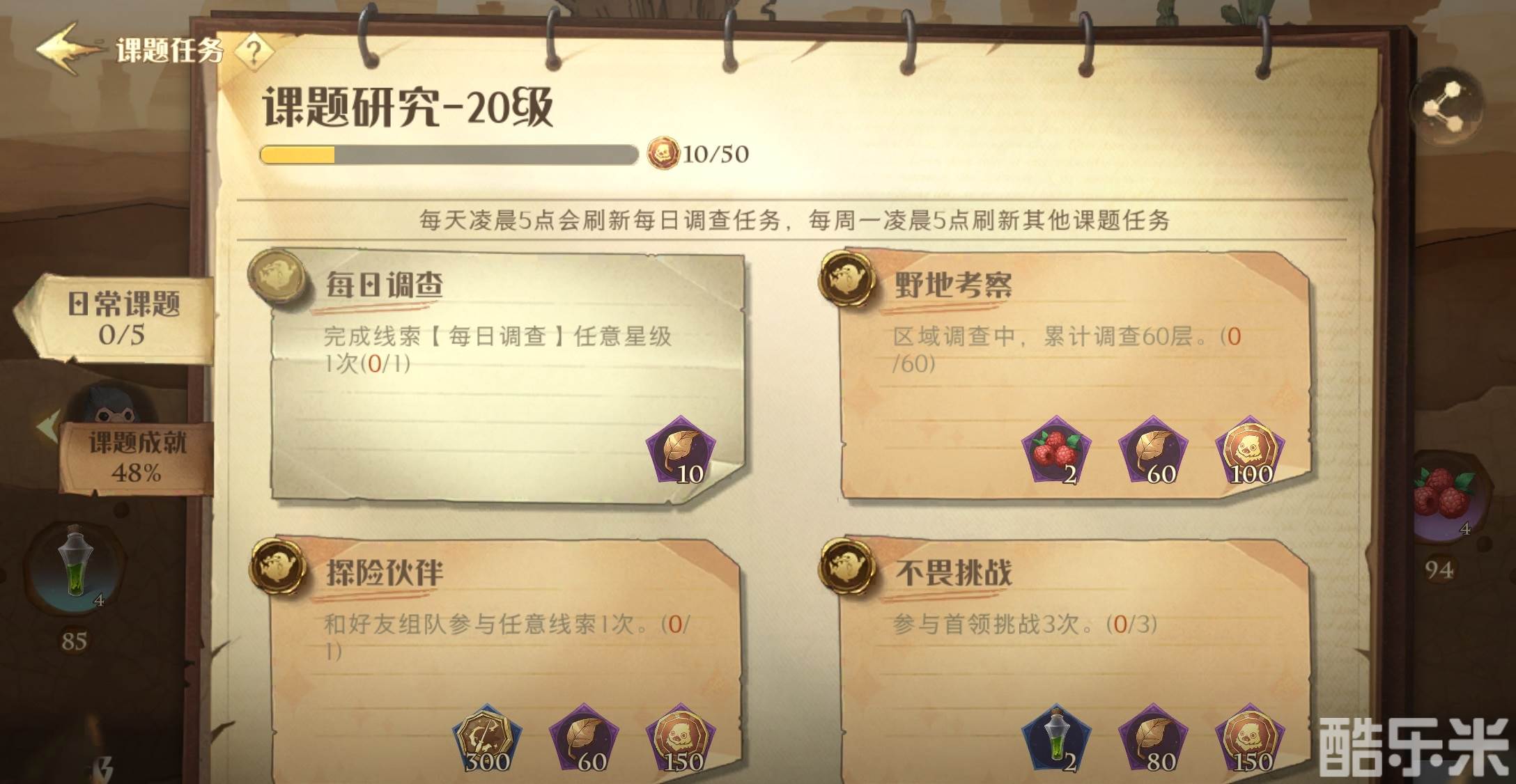 1.每日调查为单人禁林,每天5点刷新次数,一共10星,参考原来的蓝色禁林升星机制,奖励可重复获取。