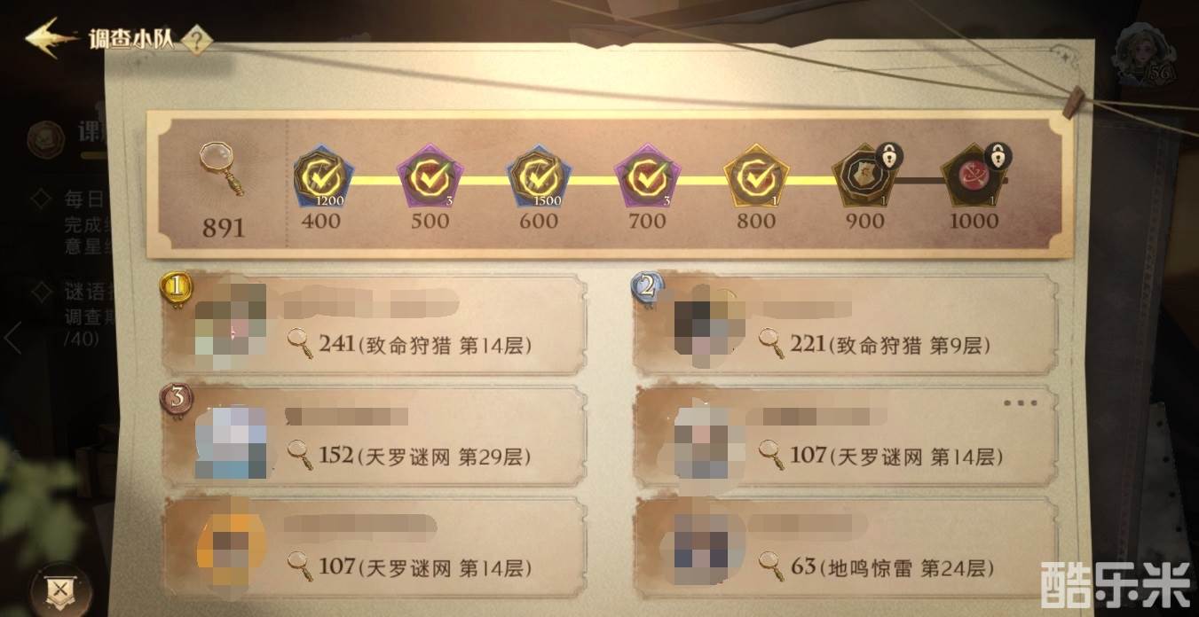 本次调查小队和追忆之境类似,区别在于取消了小队每日任务。最高可以6人组队,需要冲榜的玩家请务必在一个小队里,因为小队满级以后组队打禁林有额外的伤害加成。小队积分算法为历史通关最高层数转换积分,6个人每人最低要达到167分即可拿满奖励【也就是每人通关天罗谜网即可】。