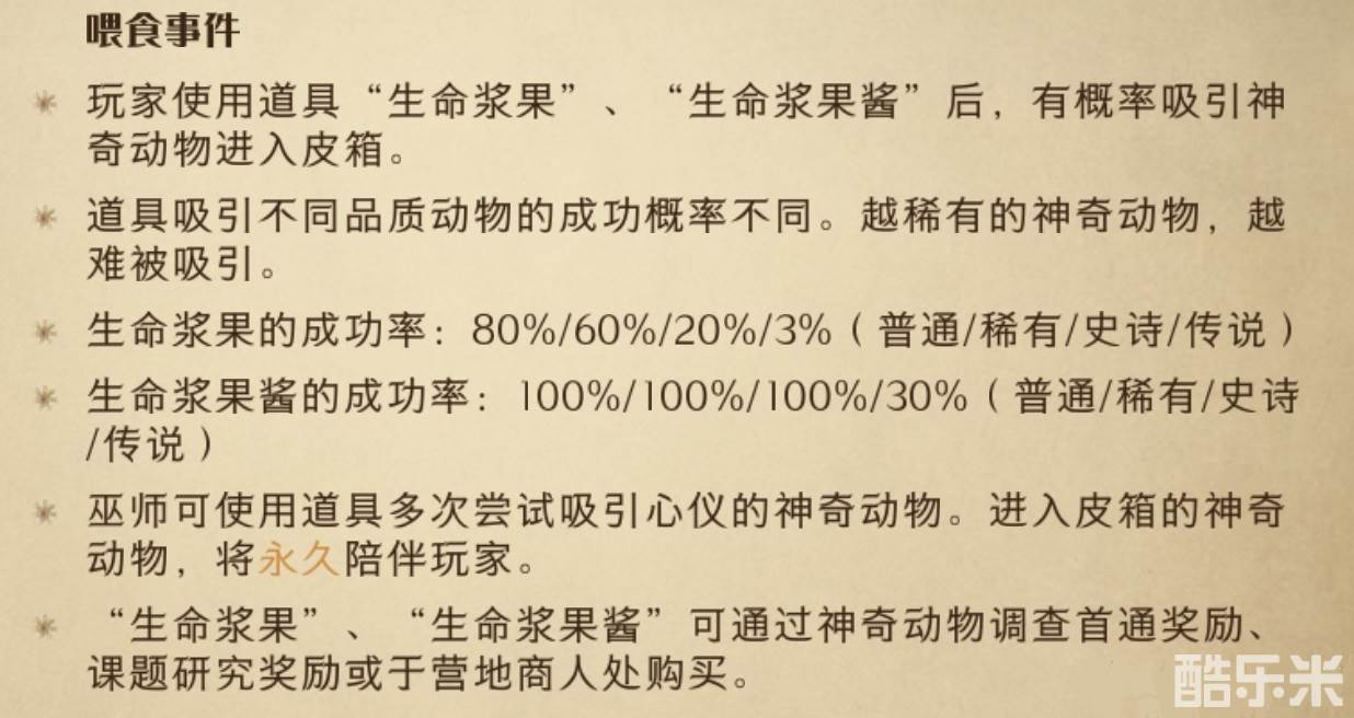 神奇动物拥有亲密度系统,亲密度提升方法为携带神奇动物战斗或者在神奇动物空间互动,神奇动物的品质越高亲密度的上限也会越高,当亲密度提升以后会增加神奇动物战斗词条的基础数值。