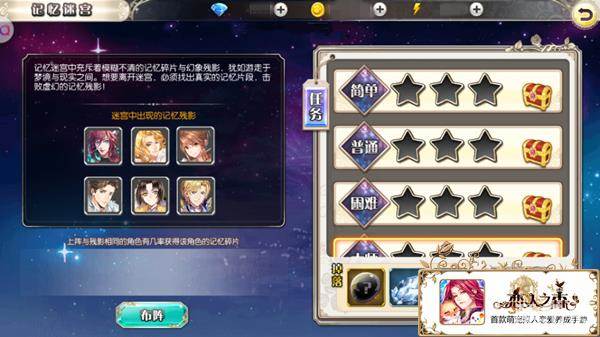 记忆迷宫中充满了模糊不清的记忆碎片与残影,找出真实的记忆片段是离开记忆迷宫的唯一途径,击败虚幻的记忆残影就可以获得胜利,记忆残影分属于各个王子,因此,想要取胜,在布阵方面要选择与残影相同的角色则可以提高获得该角色记忆碎片的概率。