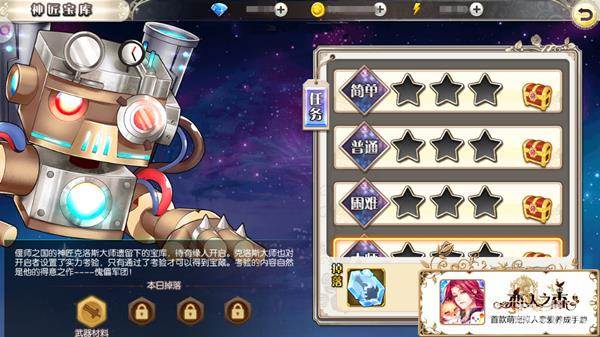 偃师之国的神匠克洛斯大师遗留下宝库,正在等待着你的开启。克洛斯以毕生心血创造了傀儡军团,来守卫这座宝库,想要开启宝藏必须要通过重重考验。打败军团的布阵方法推荐前排力型王子,后排两敏加一技,这里强力推荐擅长帮助团队回血的尼尔殿下~