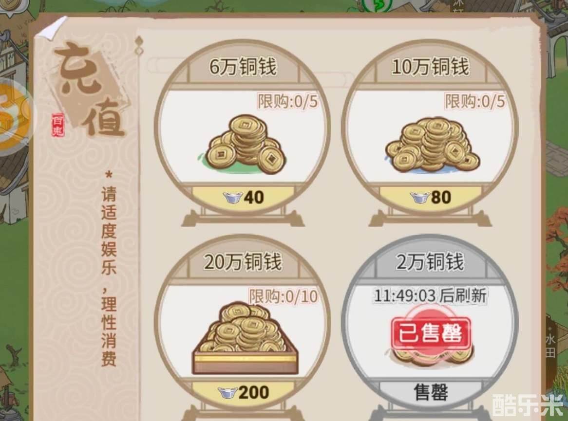 4、商店可以直接使用银两兑换铜钱,10两2万铜钱,每天可以购买10次;再用铜钱买银两,每天可以买20次,全部卖掉的话相当于白嫖100两,只买10次的话相当于是白嫖10万铜钱;