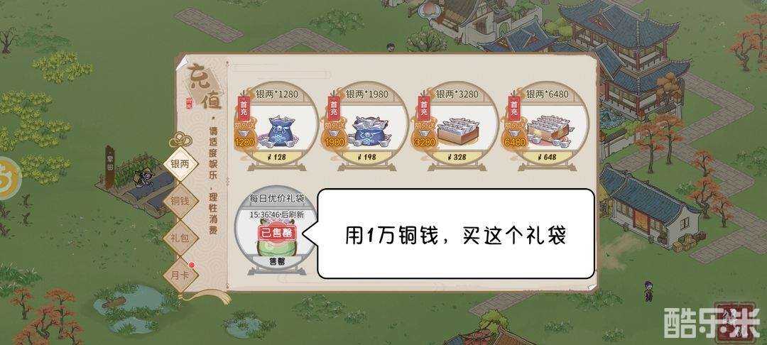 点商店,用10银子买2w铜钱,再点银两,买那个每曰优价礼袋,能多赚2万铜钱。