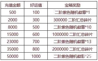 【活动内容】活动期间可通过充值金币获得好运值,积累好运值即可打开宝箱奖励,超多的徽章碎片,徽章等级不断攀升,绝对超值的提升战力资源,尽在特惠好礼。