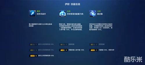 伊欧的被动技能对步兵战术,可以大幅度的提升对敌方造成的伤害,当升到满星的时候,伤害加成达到了百分之二十,这已经是将整个队伍的输出提高了一个档次。主动技能改良型混沌能量立场,可以笼罩区域内的敌人,然后降低区域内敌人的命中值,命中低了自然对方的输出就低了。另一个主动技能是对所有敌人造成伤害并且击退,并且还能降低技能充能的速度。