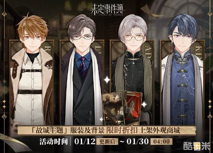 3.0版本更新后,「夏彦·故城」服装、「左然·故城」服装、「莫弈·故城」服装、「陆景和·故城」服装、「故城歌舞厅」背景和「故城酒店」背景将在「商城-外观商店」页面限时折扣上架,开放购买。