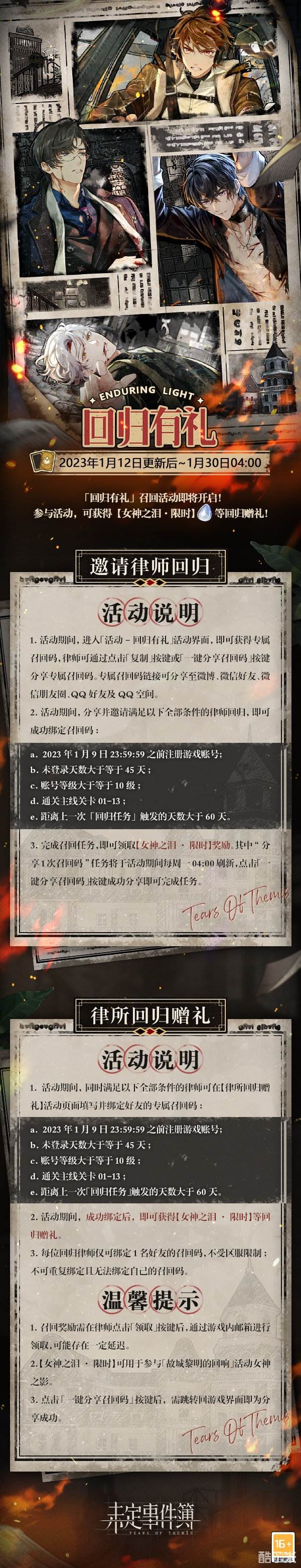 3.0版本更新后,「故城黎明的回响」大型新春版本主题活动限时开放。完成限时任务可获得活动限定R思绪、活动限定徽章【旧事迷局】、活动限定名片【盛典·故城】及【未名晶片】等多样奖励;律师还可在活动兑换所兑换活动限定邀请函【消失的旧时光】。