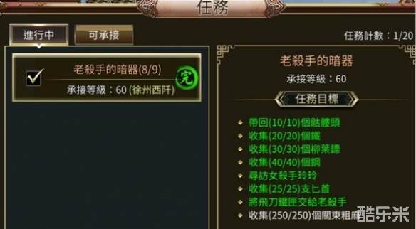 1.徐州西打杀手收集杀手秘帖x1(开任务用)柳叶镖x30匕首x25