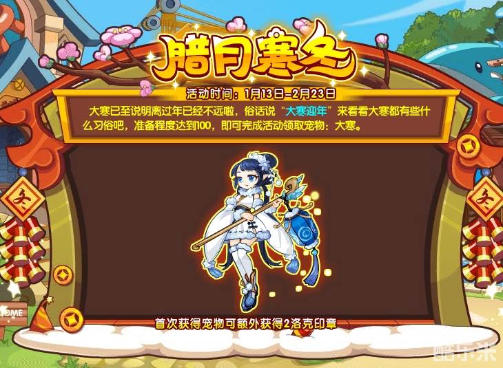 大寒已至说明离过年已经不远啦,俗话说“大寒迎年”来看看大寒都有些什么习俗吧,准备程度达到100,即可完成活动领取宠物:大寒。