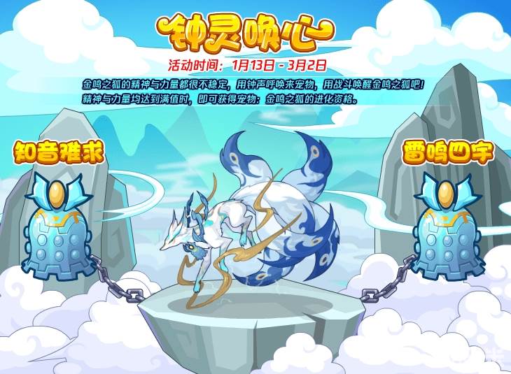 洛克王国钟灵唤心活动在空音水榭地图可以参加,1月13日正式上线,金鸣之狐的精神与力量都很不稳定,大家需要用战斗唤醒金鸣之狐。下面就给大家带来了《洛克王国》钟灵唤心活动攻略,感兴趣的速来围观吧!