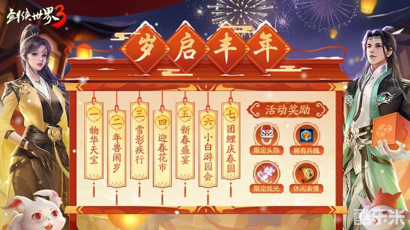 福兔迎春,岁启丰年。《剑侠世界3》兔年贺岁版本将于1月18日开启“岁启丰年”、“福兔迎春”两大系列十四重欢庆新春活动!兔年来临,江湖张灯结彩,各位少侠可穿华裳,骑萌宠,携奇兵,与好友相约“迎春花市”,逛庙会,猜灯谜;还可以前往家族,享受“新春盛宴”;除此之外,还有畅行江湖的“雪影疾行”活动以及击退年兽拿福袋的“年兽闹岁”活动等待少侠参与!更有海量的新春游戏道具奖励等你来拿哦!