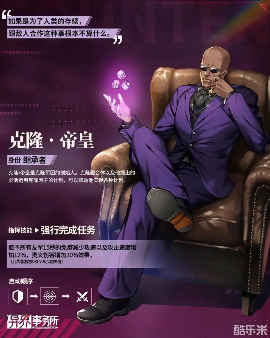 机务员克隆·帝皇的指挥技术将赋予己方一定时间内的免疫减少攻速的效果,同时将赋予增加一定的攻击速度、奥义伤害的效果。