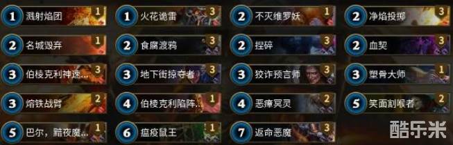 最后说到生物。【溅射焰团】是优质的1费生物,亡语打1神烦,运气好可以带走对手2费生物。【火花诡雷】延迟后可以补刀也可以打脸,满编。【不灭维罗妖】站场非常赖皮,但是我们的2费曲线比较高,只带了1个。【食腐渡鸦】配合我们这种小生物众多的套牌效果较好,可以在生物交换中不降低打脸效率。【伯棱克利神速斥候】是实用的3费冲锋,必要时可以解场;【地下街掠夺者】身材标准伤害也不低,对进攻性卡组来说同样非常优秀,这两个都满编。【狡诈预言师】站场兼过牌,虽然有自伤效果,但对我们来说,血量也是一种支付出去的资源。【塑骨大师】同样也是配合小生物的一张神卡,提高我方的生物质量,可以理解为一种另类的buff。【伯棱克利陷阵兵】也是我们急需的冲锋,不过因为有限制条件所以只带了1张,【恶瘴冥灵】出场不多,但快攻卡组很容易打成打1抽1的局面,这时候4费87隐匿就非常厉害了。【笑面割喉客】既可以战场也可以解场。【巴尔】负责终结对手,或者终结自己。【瘟疫鼠王】站场强力,但是再强力也比不上【返命恶魔】。【返命恶魔】主要用来复活【食腐渡鸦】,【火花诡雷】也是不错的目标。