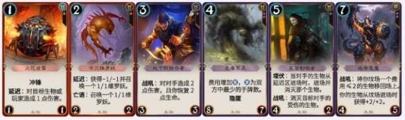 最为快攻套牌,前期我们不要怕手牌耗尽,要尽可能铺场掌握场面优势。后期的高质量生物让我们并不怕后期和对手打1抽1,而我们众多的过牌续航也可以保证我们的战斗力。秘境中解场是非场重要的属性,即使是快攻卡组也要带上为数不少的解场来防止进攻受阻。所以我们的战斗策略就是:前期进攻,中后期铺场后继续蹭伤害,最后用终结手段带走对手。