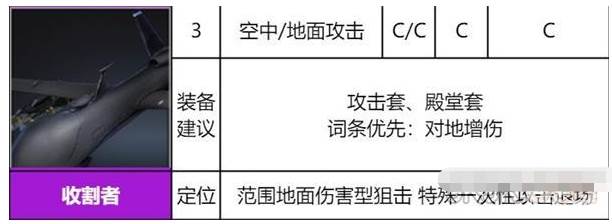 特殊一次性空中狙击,对地面进行轰炸打击后飞至地图边缘退场,可用于切后但作用不显著。