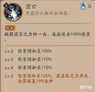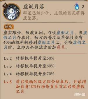 虚实难分,敌我无间。召唤虚假之月,当虚假之月存在时,敌方的普攻及单体技能有40%的概率转移到虚假之月上。召唤虚假之月时,立即为全体敌方附加惑星。