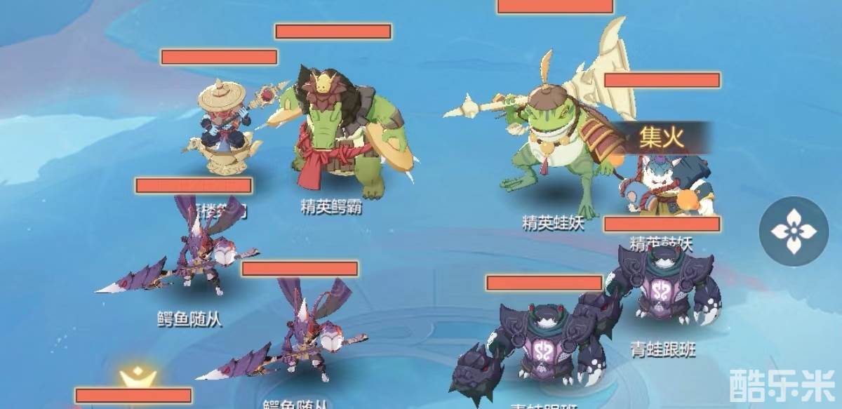 简单解释一下这么打的原因,因为一般野队对输出控制和指挥上都很粗略,这种打法能够兼顾容错率和通关速度。鼓妖第2回合会释放清水解封蜃楼祭司,并附加免封状态,因此要优先清掉。奶妈给被点名目标上金钟罩之后,左边的鳄鱼3人组基本只能造成累计3K左右的伤害,无伤大雅,反而右面的群秒输出较多,可以考虑用宝宝封掉。