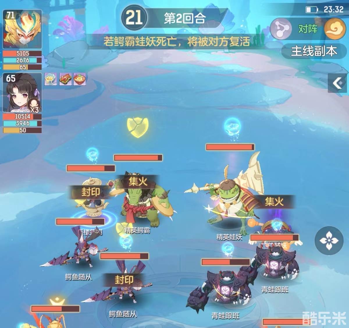正常情况下对面蜃楼祭司被封,鼓妖倒地,左边鳄鱼三人组进入易伤状态。右边青蛙三人组准备释放高伤群攻。
