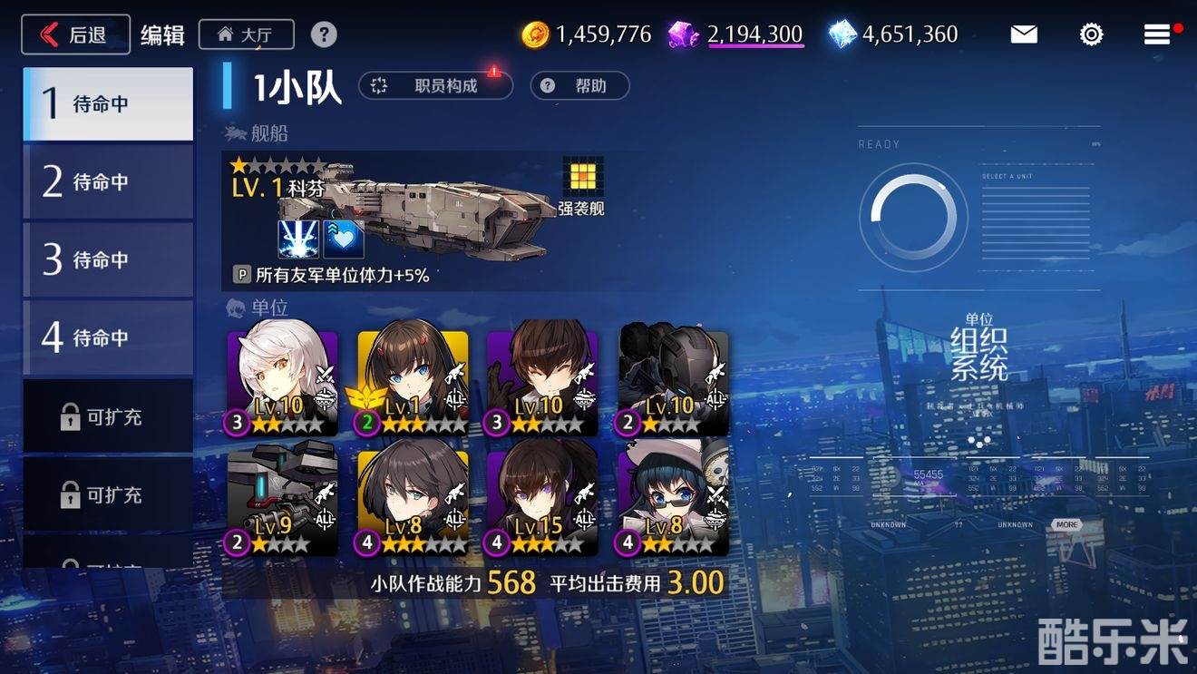 1、一个队伍由一艘舰船和八个角色组成