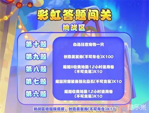 如果你足够了解《彩虹岛》,那你将有机会获得以下奖励:前五题是比较常规的奖励,如魔法时尚卡(不可存仓)x10、苏生药剂(不可交易)x50;而后五题的奖励就比较稀有了,不仅有超级附魔装备强化晶石(不可交易)x10,还有超越II收费地图12小时使用券(不可交易)x10,答对最后一题的玩家将能够自选任意宠物一只,是任意宠物哦,你心动了吗?