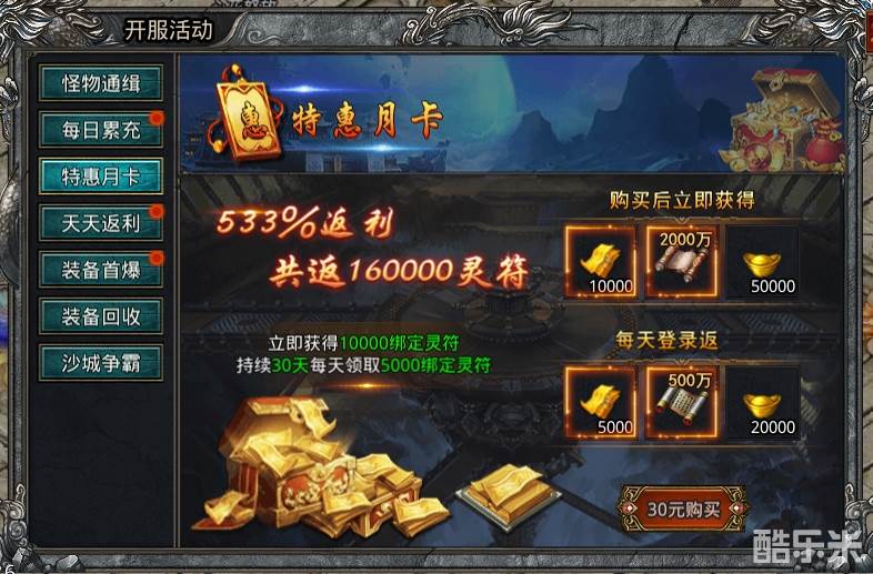 超值月卡购买立得海量灵符、经验卷和元宝,每日登录都可获得当日礼包,合计533%的返利,不容错过。