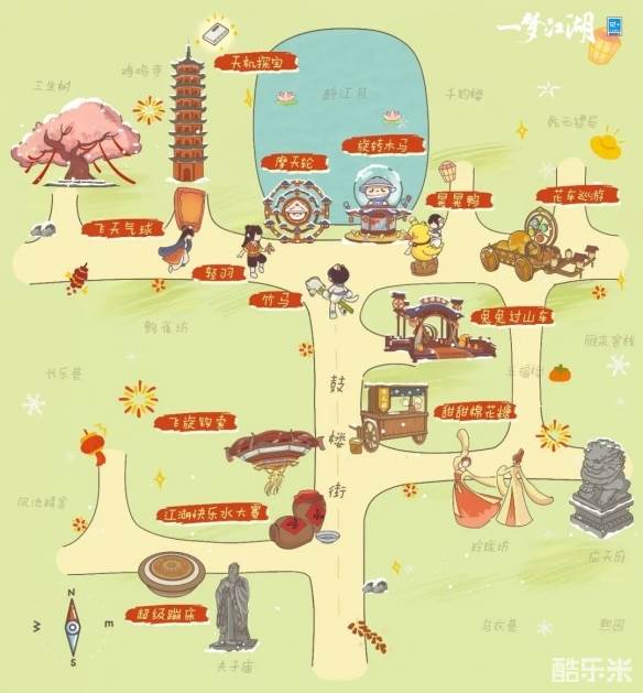今年天机阁研究出的逗趣新玩意儿——驰骋整座金陵城的“兔兔过山车”,真是风靡万千江湖少侠!只要坐上这车,少侠们将从玲珑坊大街疾驰而过,绕过夫子像留下美好心愿,朝鸡鸣寺凌空一跃,又向酹江月纵身俯冲……起起落落间,一时身处凌空万里,一时体会自由落体的刺激,充分感受速度与激情!