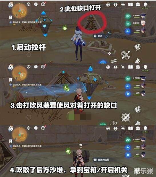 我们在神殿遇到的第一个机关就是吹风机,操作方法也很简单,打他一下就可以转换他的风向,把风向对准沙堆位置即可吹散沙子