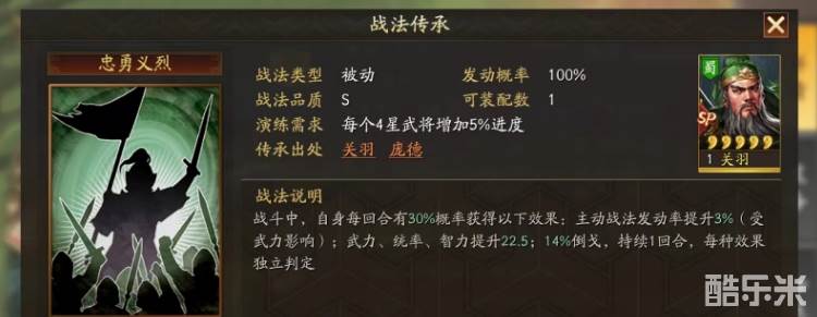 首先需要了解一下这一项战法的效果和具体获取的难度,要想得到忠勇义烈,需要先获取SP庞德或SP关羽,然后利用这两张卡牌分解掉所传承出来。这就意味着刚刚获取的武将就要被分解掉,代价不可谓不大,所以一定要搞清楚具体的用法。此战法的效果是在进入到战斗中之后自身每回合都有几率获得以下效果之一,有提高主动战法的发动率,提高武力、统率和智力属性,以及获得倒戈状态,当达到满级时,每回合触发几率为60%。