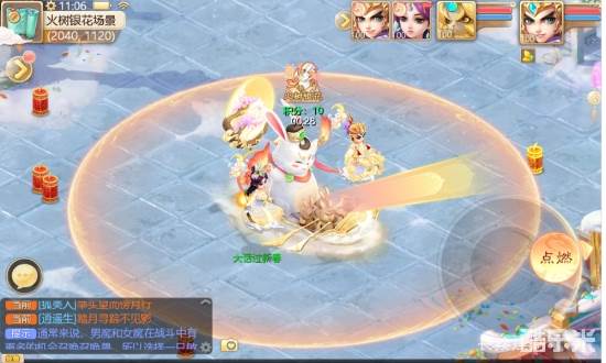 活动开启后,玩家双方需要同乘双人坐骑进入活动区域,通过二人配合完成活动。其中队长负责操作坐骑在场景内移动,躲避延时爆炸的红圈;场景中将不定期刷出烟花,队员负责控制摇杆点燃地上的烟花,点燃烟花能够获得积分。
