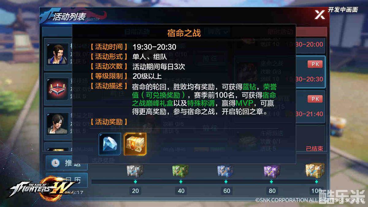 《拳皇世界》“宿命之战”属于当下热门的MOBA类玩法,玩家将分为“八神古流”“草薙古流”两方进行实时PVP对决,每方可单人或组队(最多8人)参与,并在活动结束后获得超高福利的奖励。达到一定等级的玩家,即可在格斗之城找到“神乐千鹤”,点击参与“宿命之战”活动,除此之外在屏幕界面中点击活动下拉列表也可以找到“宿命之战”相关信息。