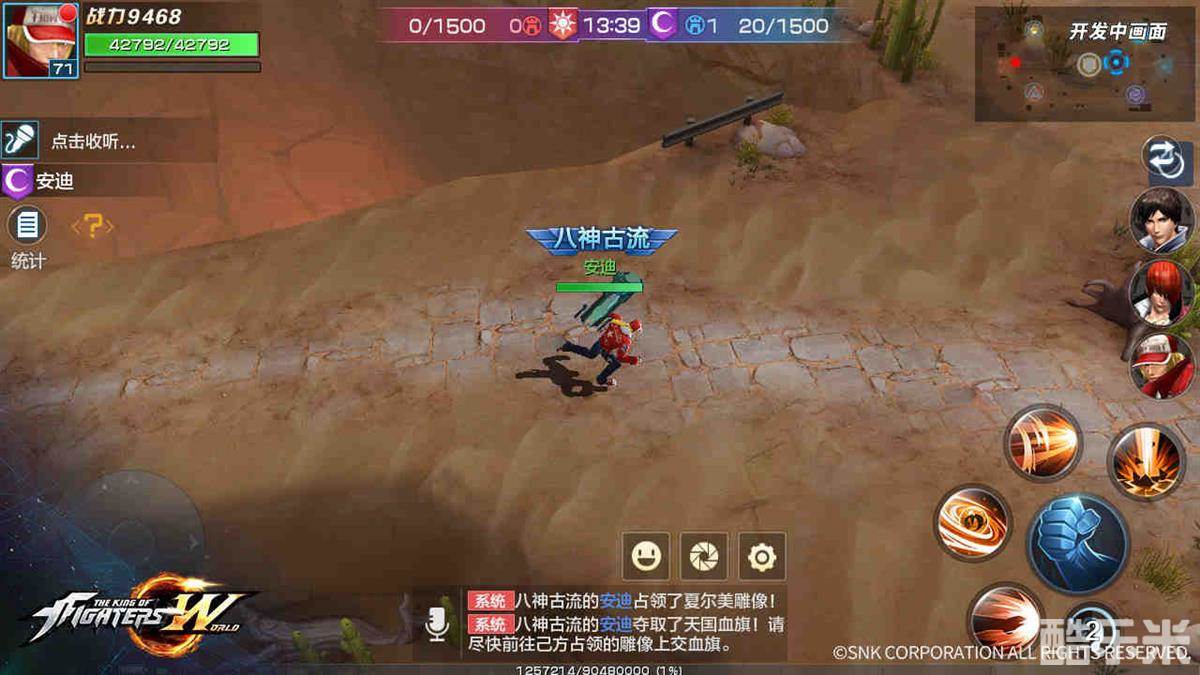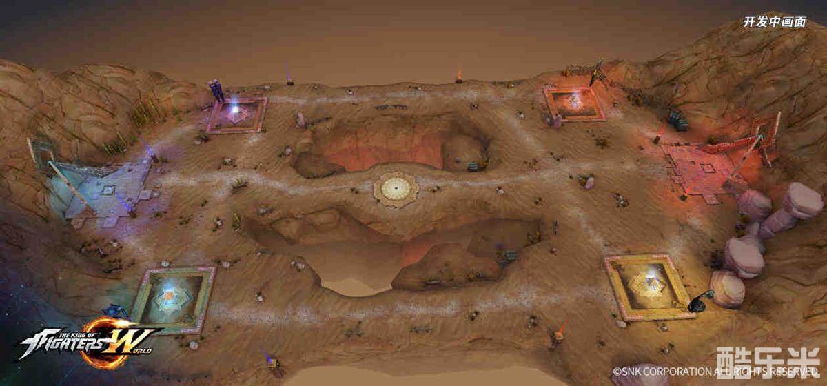 “宿命之战”作为攻防类的活动模式,地图的设计就很考究了。《拳皇世界》的开发者们对于这块土地显然十分用心。大场景为悬空的戈壁,共红蓝两座基地、三条通路、四座雕像。双方的基地于相对的两座险峰之下,游戏开始时为安全区,红方为“草薙古流”,蓝方为“八神古流”进行宿命对决。四座雕像分别为四个颜色,且每处雕像旁竖立的器物也不同。三个通路宽窄不一,中央为战旗刷新地。
