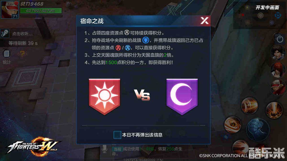 “宿命之战”一改往日格斗游戏模式,虽也需要K.O你的对手,但取得游戏的胜利,并不依靠“人头数”, 通过占领四处雕像,从而持续获得积分,当其中一方的积分首先达到1500时,该队游戏胜利。这样的模式,游戏的胜负就有意思多了,不再单纯受限与对格斗家技能的操作,良好的战术才是取得宿命之战胜利的关键。
