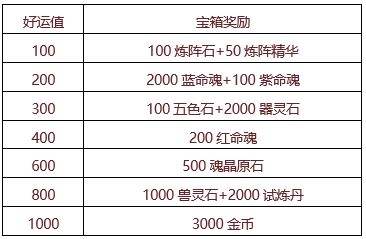 【活动内容】活动期间,每消费1000金币,即可获得100好运值,累计获得好运值可开启奖励宝箱。