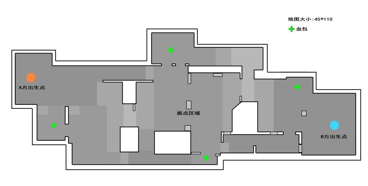 地图的共有四处血包点,出生点的斜坡可以提供良好的视野,中央广场区域较为开阔,四周被狭长通道围绕。利用好通道,或许可以来一招出其不意的绕后(老六)之策哦!
