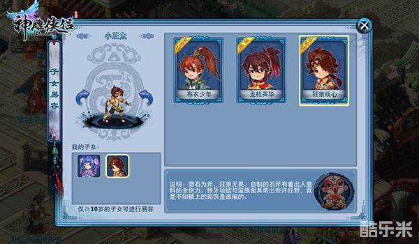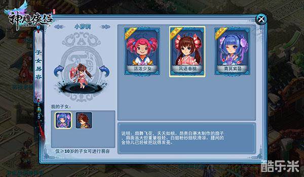本次资料片更新后,子女满10周岁即可开启子女易容功能。大侠们可通过元宝购买或使用子女易容卡的方式获得子女造型。男孩女孩变变变!快去易容专属自己子女的时尚新形象吧。