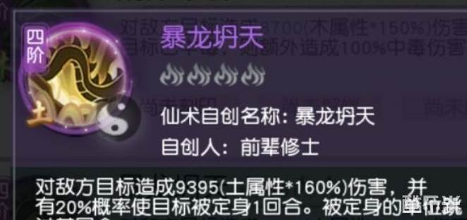 暴龙坍天这个仙术是土属性的仙术,所以造成的伤害都是土属性的伤害,并且有五分之一的概率将敌人定身一回合,被定身的敌人跳过其他回合哦,所以说暴龙坍天的控制效果还是非常厉害的哦!