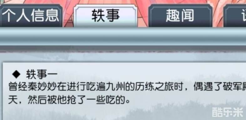 关于秦妙妙的轶事其实有不少呢,因为秦妙妙是一个吃货,肯定是有一些关于吃的经历了,果然,可以看到秦妙妙是有四条轶事,分别是抢过破军殿伟天将军的吃的、在河边发现了龙角怪人、秦妙妙的灵宠将山伯认成了吃的以及秦妙妙只要吃东西就可以增加修为这些轶事,通过这些可以看出秦妙妙真是一个十足的吃货哦!