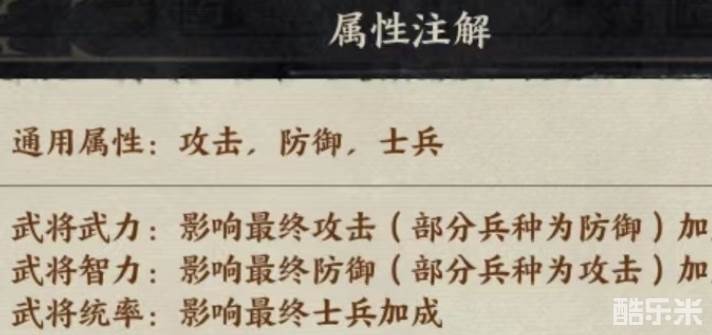 在所有属性中最关键的三个也是最基础的就是攻击、防御和士兵,而影响这三项的是武将自身武力、智力和统率。武力影响最终攻击力,智力影响最终防御加成,统率影响最终士兵加成,对于士兵大家可以理解为其他游戏中的血量。这样对很多卡牌中的元素就有了更深入的了解,接下来是一些更加详细属性划分,包括命中,闪避,重击,暴击,韧性等。
